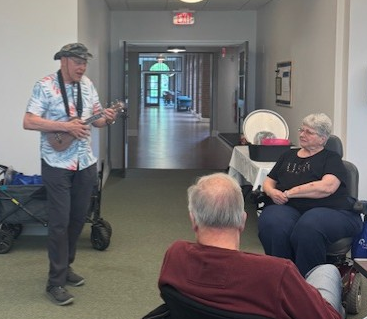 By 2016, after retiring, Jack had founded a ukulele club. The group performed in care centers until the pandemic put gatherings on hold. When he moved into Saint Therese – IHM in 2022, Jack decided it was time to start again.